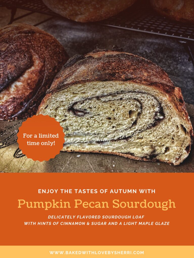 Introducing the newest addition to the Baked with Love by Sherri lineup — our Pumpkin Pecan Sourdough Loaf. Made with real pumpkin, toasted pecans, cinnamon sugar, and finished with a touch of maple glaze, this loaf offers a delicate yet delightful flavor profile. Enjoy it plain, spread with butter, or take your French toast to the next level by using this seasonal favorite.